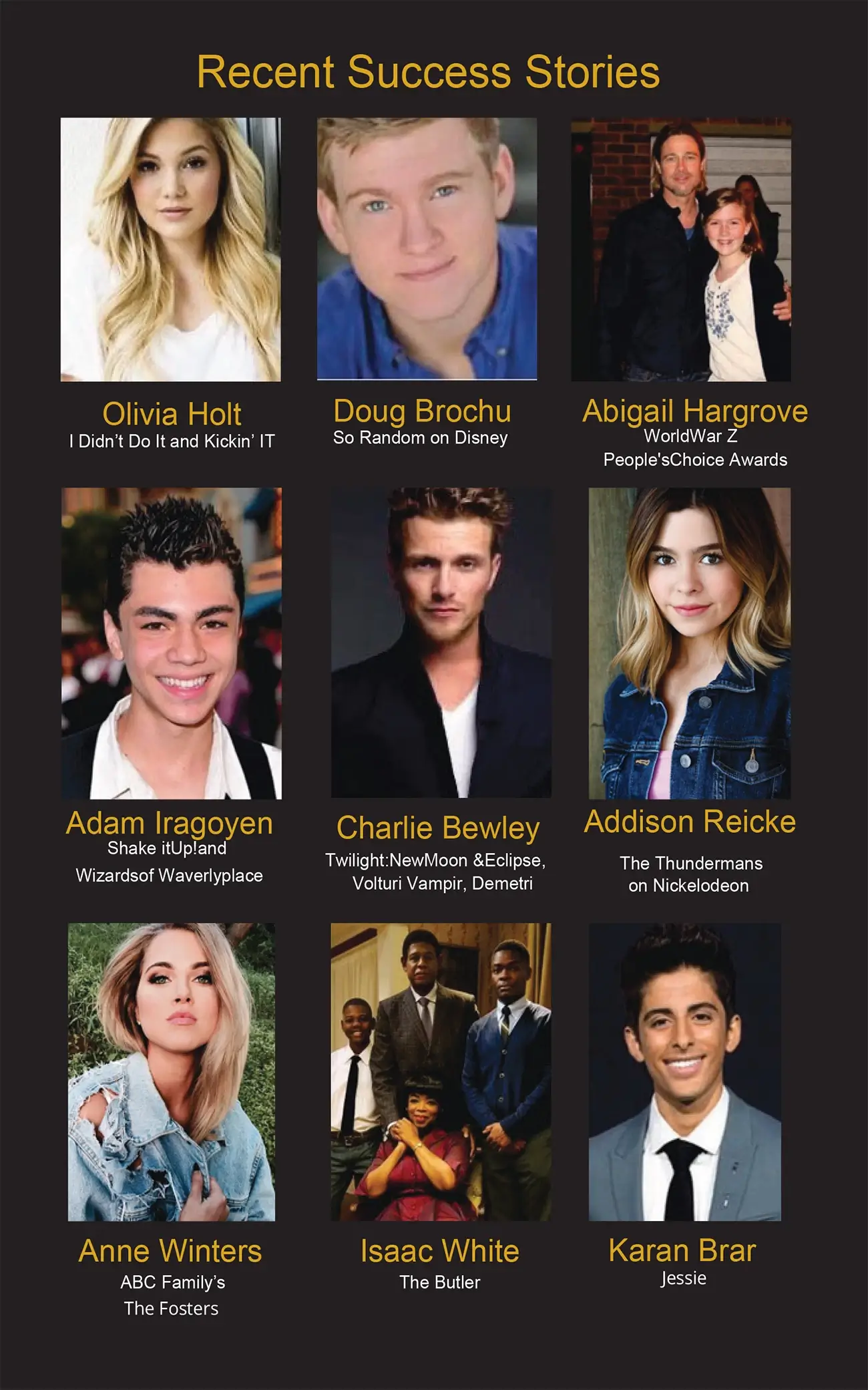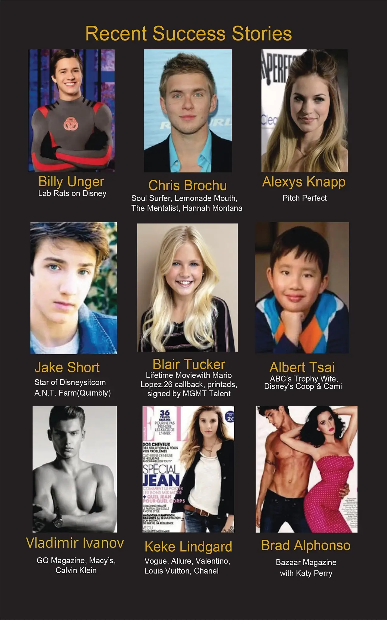 Bringing excellent talent and unmatched opportunity together, worldwide. We use our network of over 100 agents, casting directors, managers and record labels to help you live your dream.